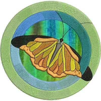 This digital machine embroidery design features a beautifully detailed butterfly in shades of orange and yellow, set within a circular frame of varying green and blue hues. Available in all hoop sizes.