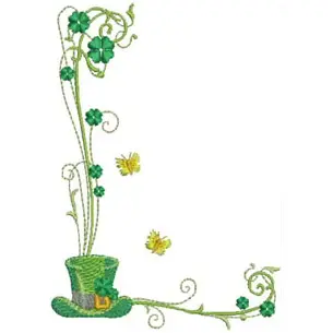 This digital machine embroidery design features a green top hat adorned with clovers and butterflies, surrounded by swirling vines.