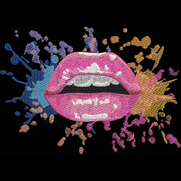 This digital machine embroidery design features vibrant pink lips with colorful splashes surrounding them. Available in all hoop sizes.