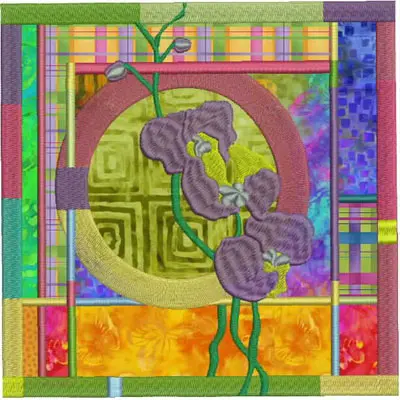 This digital machine embroidery design features vibrant colored patches framing a delicate orchid with gracefully flowing stems. Available in all hoop sizes.