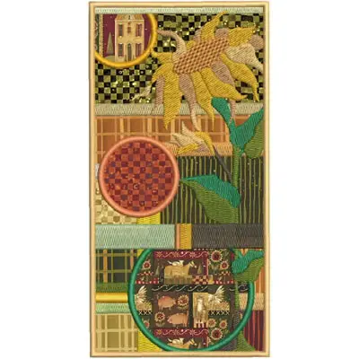This digital machine embroidery design features a vibrant sunflower alongside geometric patterns and circular shapes in warm colors. Available in all hoop sizes.