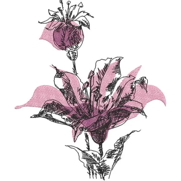 This digital machine embroidery design features a stylized flower with delicate petals in shades of pink and intricate black line detailing. Available in all hoop sizes.