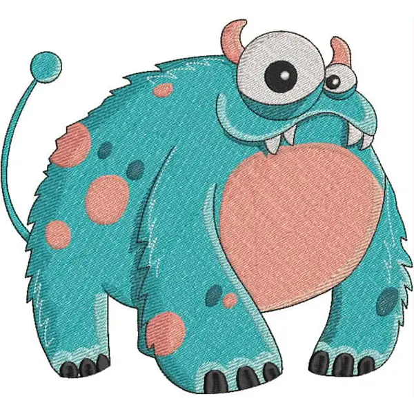 This digital machine embroidery design features a playful, blue cartoon monster with spots, large eyes, and a cheerful expression. Available in all hoop sizes.