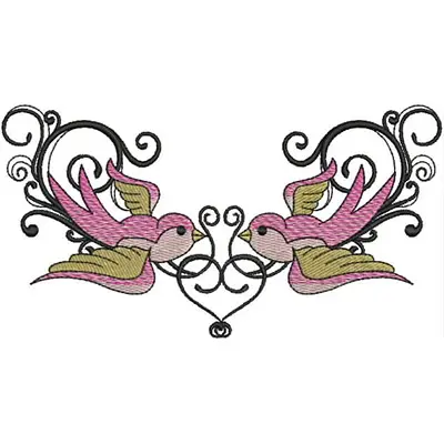 This embroidery design features two stylized birds in pink and yellow, elegantly surrounded by swirling decorative elements. Available in all hoop sizes.