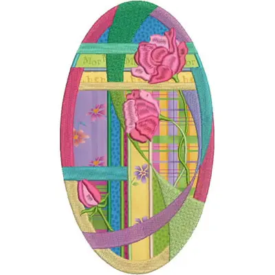 This digital machine embroidery design features stylized pink roses intertwined with colorful geometric shapes and patterns in an oval frame. Available in all hoop sizes.