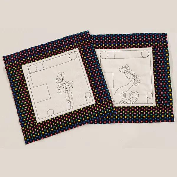 This digital machine embroidery design features a floral motif and a whimsical spiral pattern outlined on light fabric squares framed by vibrant polka dot borders. Available for 8X8 hoops.