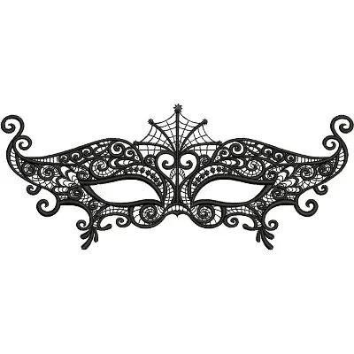 This digital machine embroidery design features an intricate black masquerade mask adorned with elegant swirls and a spider web motif. Available in all hoop sizes.