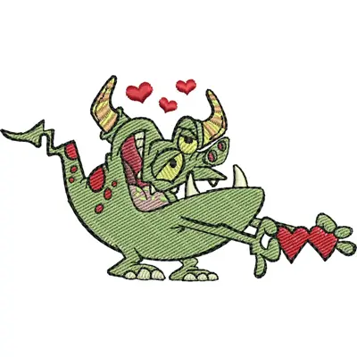 This digital machine embroidery design features a playful green monster with three eyes, charmingly holding a heart-shaped arrow and surrounded by floating hearts.