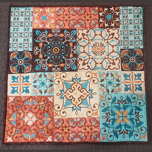 An embroidery design of an intricate patchwork featuring vibrant geometric and floral motifs in shades of turquoise, brown, and orange..