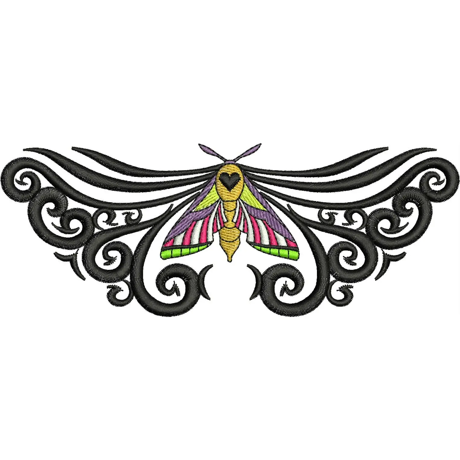 This digital machine embroidery design features a colorful moth with intricate swirls and patterns surrounding it. Available for 5X7 hoops.