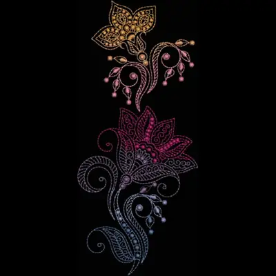 This digital machine embroidery design features intricate floral motifs featuring a yellow flower with delicate petals and a pink blossom with swirling vines and decorative elements. Available in all hoop sizes.
