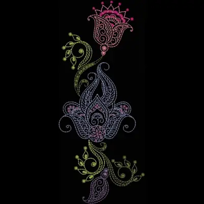 This digital machine embroidery design features intricate floral patterns featuring a prominent pink flower and ornate, swirling leaves in vibrant colors. Available in all hoop sizes.