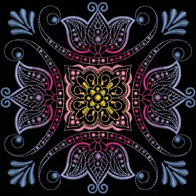 Digital machine embroidery design "MSD 5 Block" in the around the world theme for 5x7, 8x10 and all hoops an embroidery design of intricate floral motifs arranged symmetrically with vibrant colors, showcasing a central yellow flower surrounded by elegant curves and patterns. from Kreations by Kara.