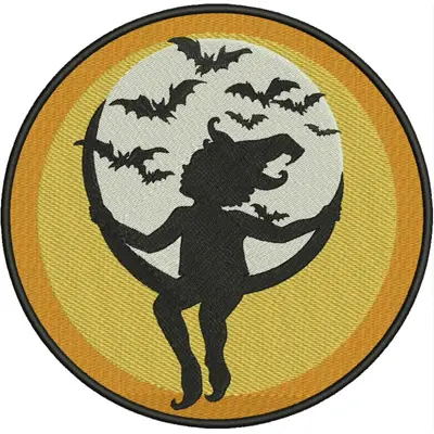 This digital machine embroidery design features a whimsical figure in a playful pose surrounded by flying bats, set against a circular backdrop. Available in all hoop sizes.