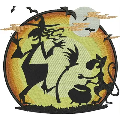 This embroidery design features a whimsical witch dancing with a cat beside a bubbling cauldron under a full moon. Available in all hoop sizes.