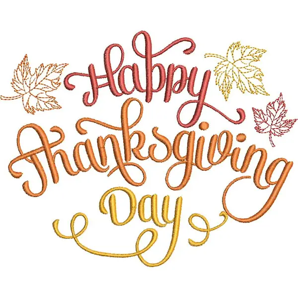 An embroidery design of the words “Happy Thanksgiving Day” in festive, flowing script with decorative leaves..