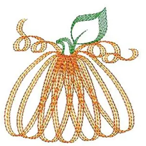 An embroidery design of a whimsical pumpkin with curly tendrils and a green leaf..