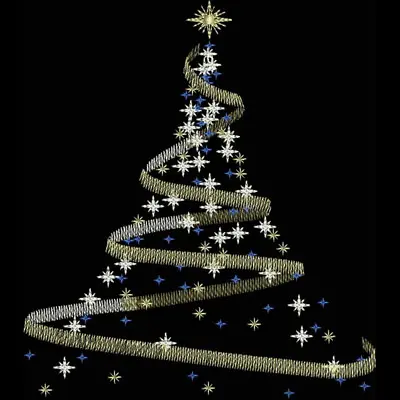 This digital machine embroidery design features a spiraled Christmas tree adorned with sparkling stars and snowflakes, showcasing a festive and whimsical aesthetic. Available in all hoop sizes.