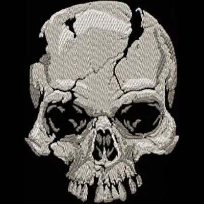 This digital machine embroidery design features a cracked skull with detailed shading and contrasting dark eyes.