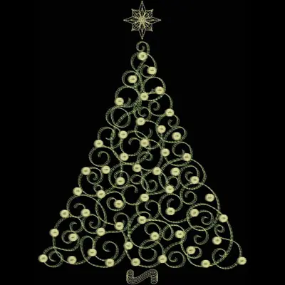 This digital machine embroidery design features a whimsical Christmas tree made of swirling lines and adorned with circular ornaments and a star on top. Available in all hoop sizes.
