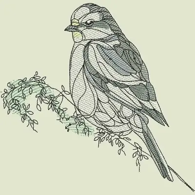This digital machine embroidery design features a detailed bird perched on a branch, showcasing elegant line work and subtle shading. Available in all hoop sizes.