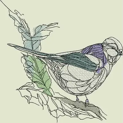 Digital machine embroidery design "OFF Blue Tit" in the 4x4 theme for 4x4, 5x7 and 6x8 hoops an embroidery design of a stylized bird perched on a branch, featuring delicate outlines and subtle colors. from Kreations by Kara.