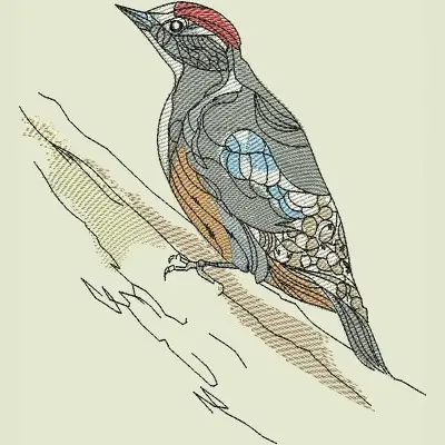 This digital machine embroidery design features a colorful bird perched on a branch, showcasing intricate details in its feathers and distinct coloration. Available in all hoop sizes.