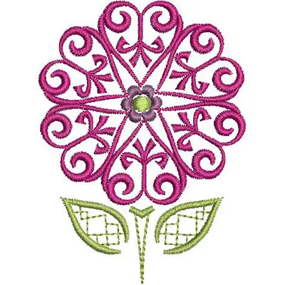 This digital machine embroidery design features an intricate floral motif featuring swirling pink petals and green leaves with a central flower. Available for 4X4 hoops.