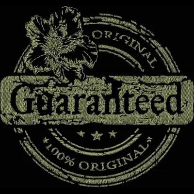 This digital machine embroidery design features a circular stamp featuring the word "Guaranteed" prominently, surrounded by the phrase "100% Original" and adorned with a floral accent. Available in all hoop sizes.