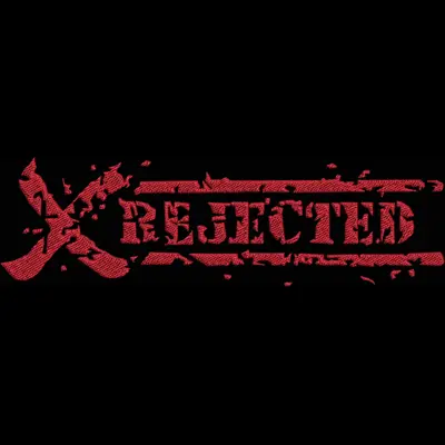 This digital machine embroidery design features the word "REJECTED" prominently displayed with a striking red color and an intersecting bold red "X" accent. Available in all hoop sizes.