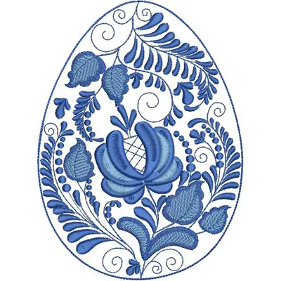 This embroidery design features a blue floral pattern featuring stylized flowers and leaves arranged within an egg shape. Available in all hoop sizes.