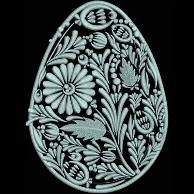 This digital machine embroidery design features an ornate egg shape featuring intricate floral patterns and decorative elements. Available in all hoop sizes.