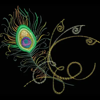 This embroidery design features a vibrant peacock feather with intricate details and swirling patterns. Available for 5X5 hoops.