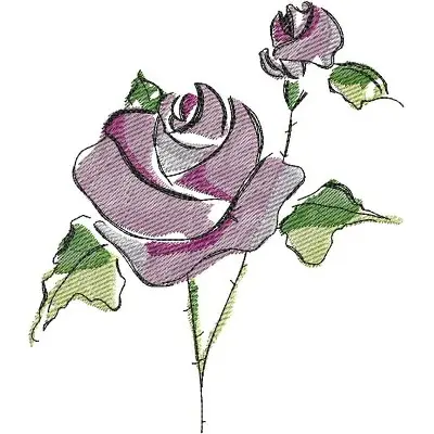This digital machine embroidery design features a beautiful rose with delicate petals in shades of purple and green leaves, accompanied by a budding flower. Available in all hoop sizes.