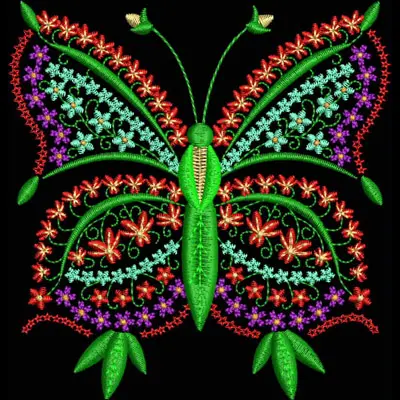 This digital machine embroidery design features a vibrant butterfly adorned with intricate floral patterns in shades of green, red, purple, and blue. Available for 4X4 hoops.