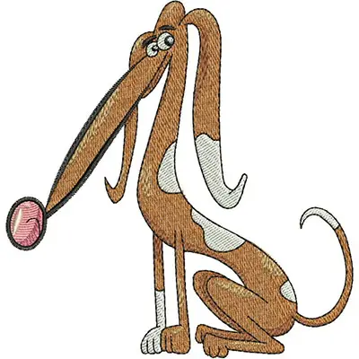 This digital machine embroidery design features a cartoonish dog with a long nose and floppy ears, sitting down and playfully looking to the side. Available in all hoop sizes.