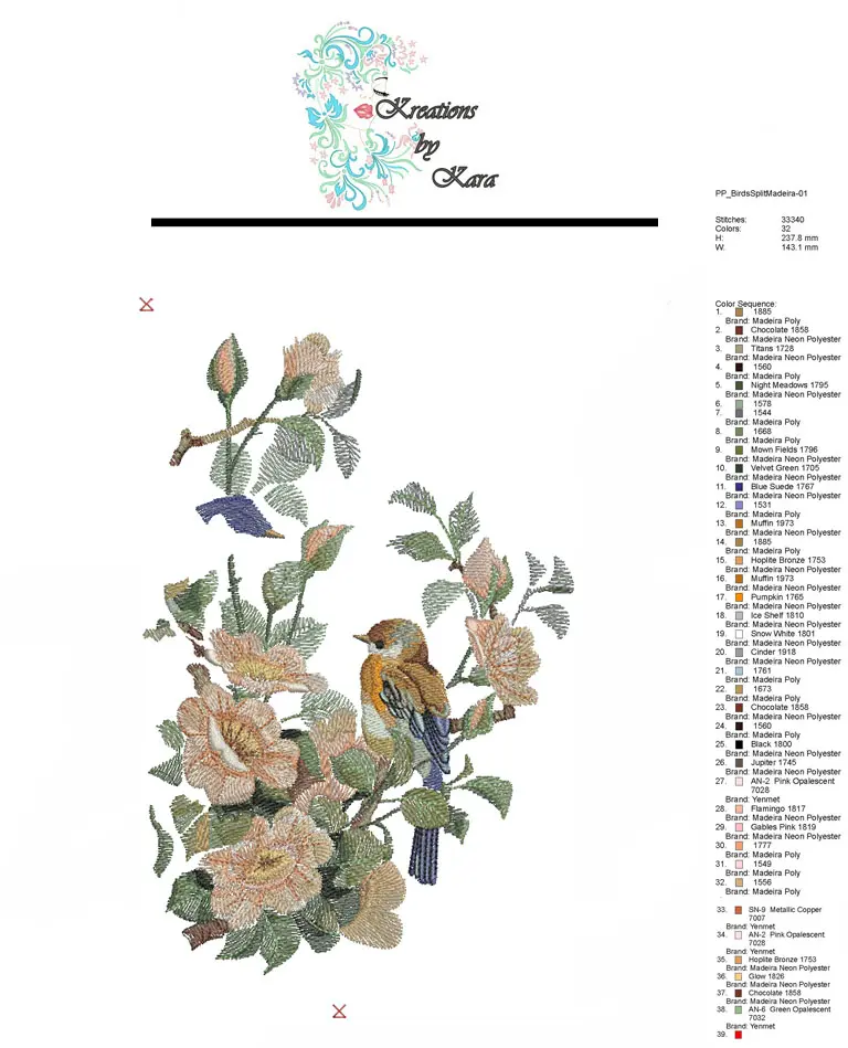 This digital machine embroidery design features two colorful birds perched among blooming flowers and intricate foliage. Available in all hoop sizes.