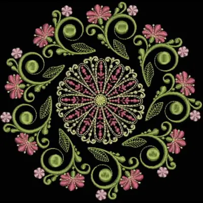 This digital machine embroidery design features a circular floral motif featuring vibrant pink flowers and leafy vines arranged around a central decorative pattern. Available for 6X6 hoops.