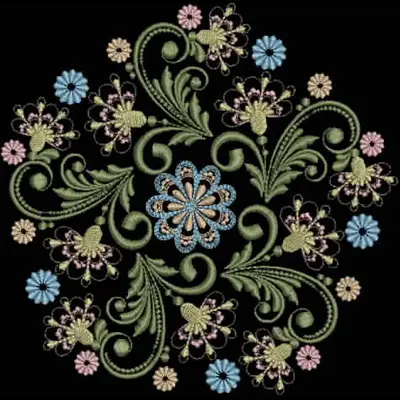 This digital machine embroidery design features intricate flowers and swirling vines in various colors, arranged in a circular pattern. Available for 6X6 hoops.