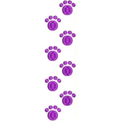 This digital machine embroidery design features purple paw prints arranged in a vertical pattern. Available for 5X7 hoops.
