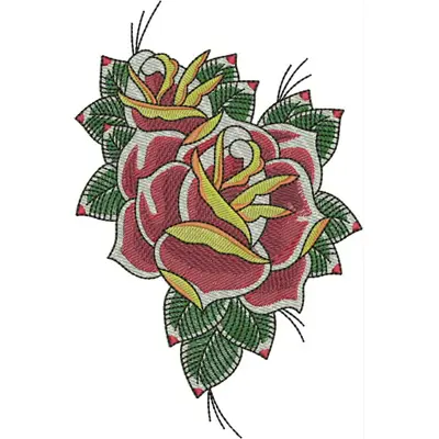 This digital machine embroidery design features two intertwined roses in vibrant shades of red and yellow, surrounded by lush green leaves. Available in all hoop sizes.