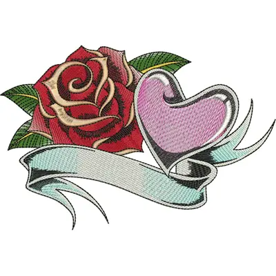 This digital machine embroidery design features a vibrant red rose complemented by a shiny heart and a flowing scroll banner. Available in all hoop sizes.