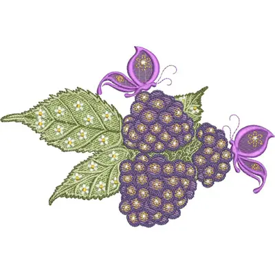 This embroidery design features lush blackberries adorned with green leaves and accompanied by delicate purple butterflies. Available in all hoop sizes.