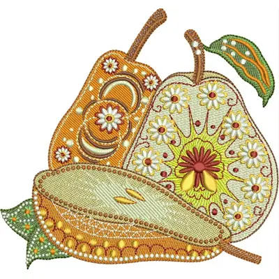 This digital machine embroidery design features three stylized fruits featuring vibrant colors and intricate floral patterns. Available in all hoop sizes.