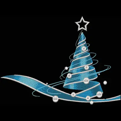 This digital machine embroidery design features a stylized blue Christmas tree adorned with spiraling ribbons and decorative pearls, topped with a star. Available in all hoop sizes.