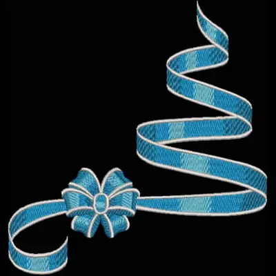 This digital machine embroidery design features a flowing ribbon in shades of blue, tied in a bow at its base. Available in all hoop sizes.