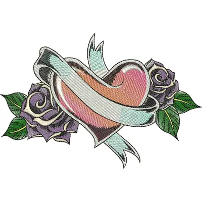 This digital machine embroidery design features a heart with a flowing ribbon, flanked by two ornate roses and leafy accents. Available in all hoop sizes.