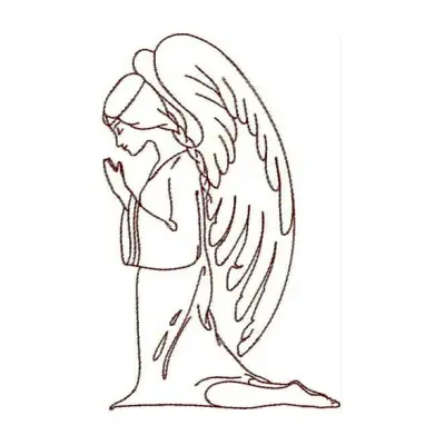 This digital machine embroidery design features a kneeling angel with folded hands and large wings. Available for 5X7 hoops.