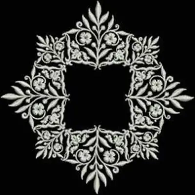 This embroidery design features an intricate floral motif arranged in a symmetrical square pattern with elegant leaves and flowers. Available for 5X5 hoops.