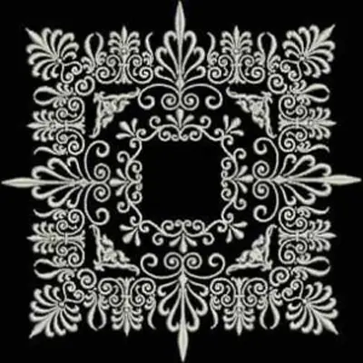 This digital machine embroidery design features an intricate square pattern featuring elegant swirls, floral motifs, and a central open space. Available for 5X5 hoops.
